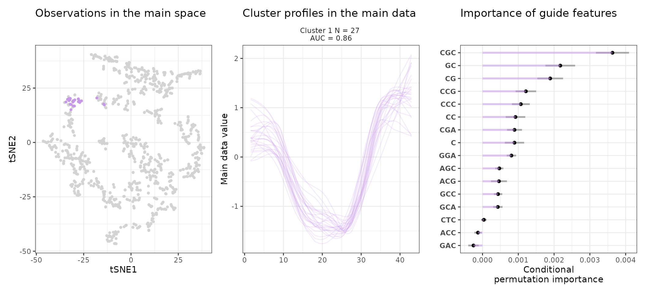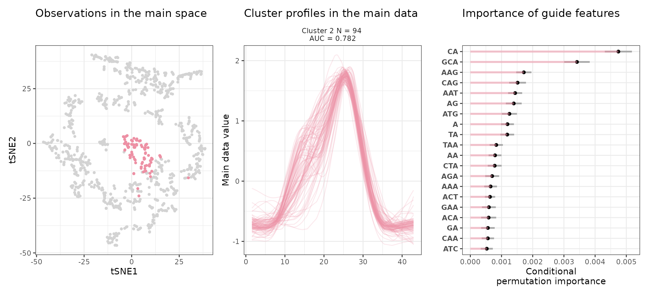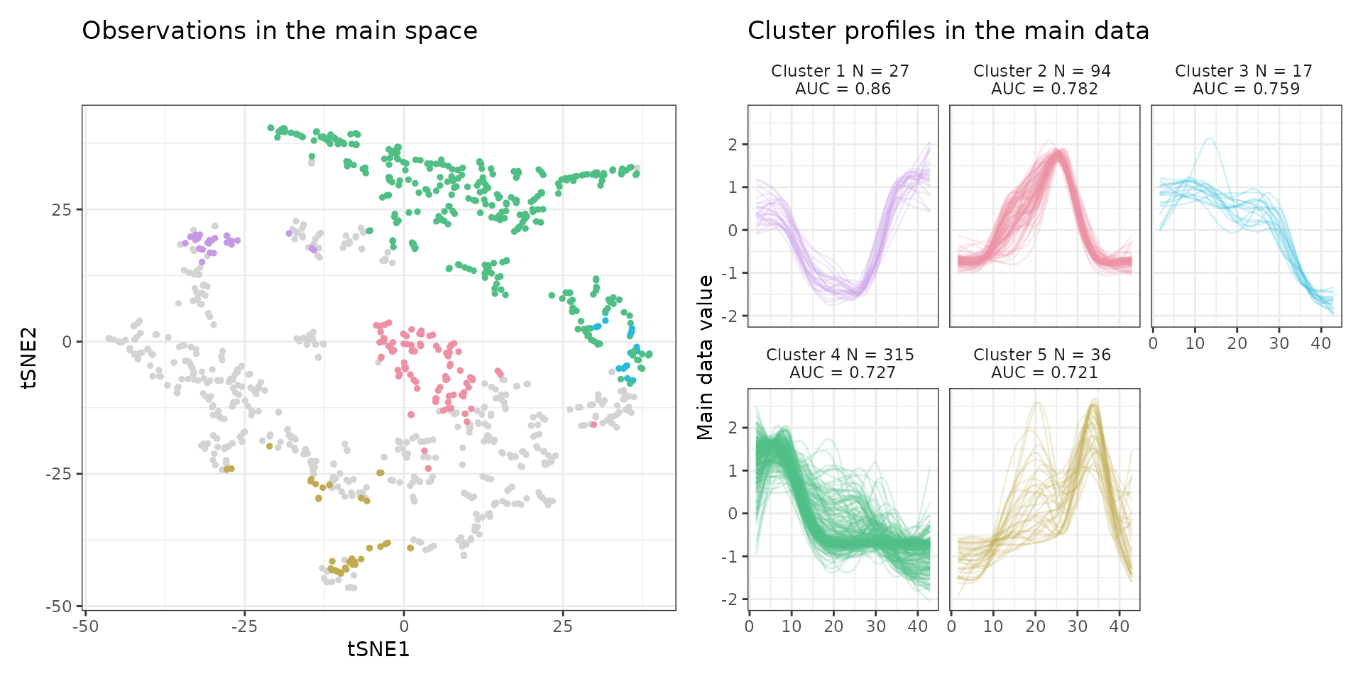 • aucs : a named vector that gives the AUC (classification performance) for each cluster.