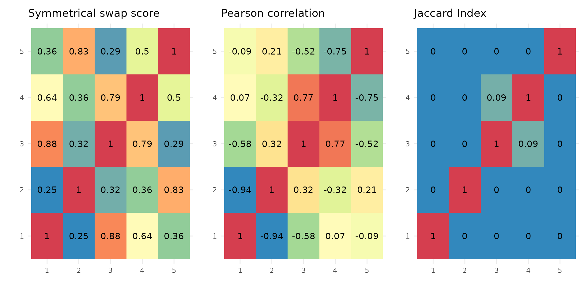 It can also be helpful to see how similar are the inferred clusters to one another. This is done internally by stoic to prune redundant clusters, but can also be visualized downstream of the clustering. Three similarity measures are used:
