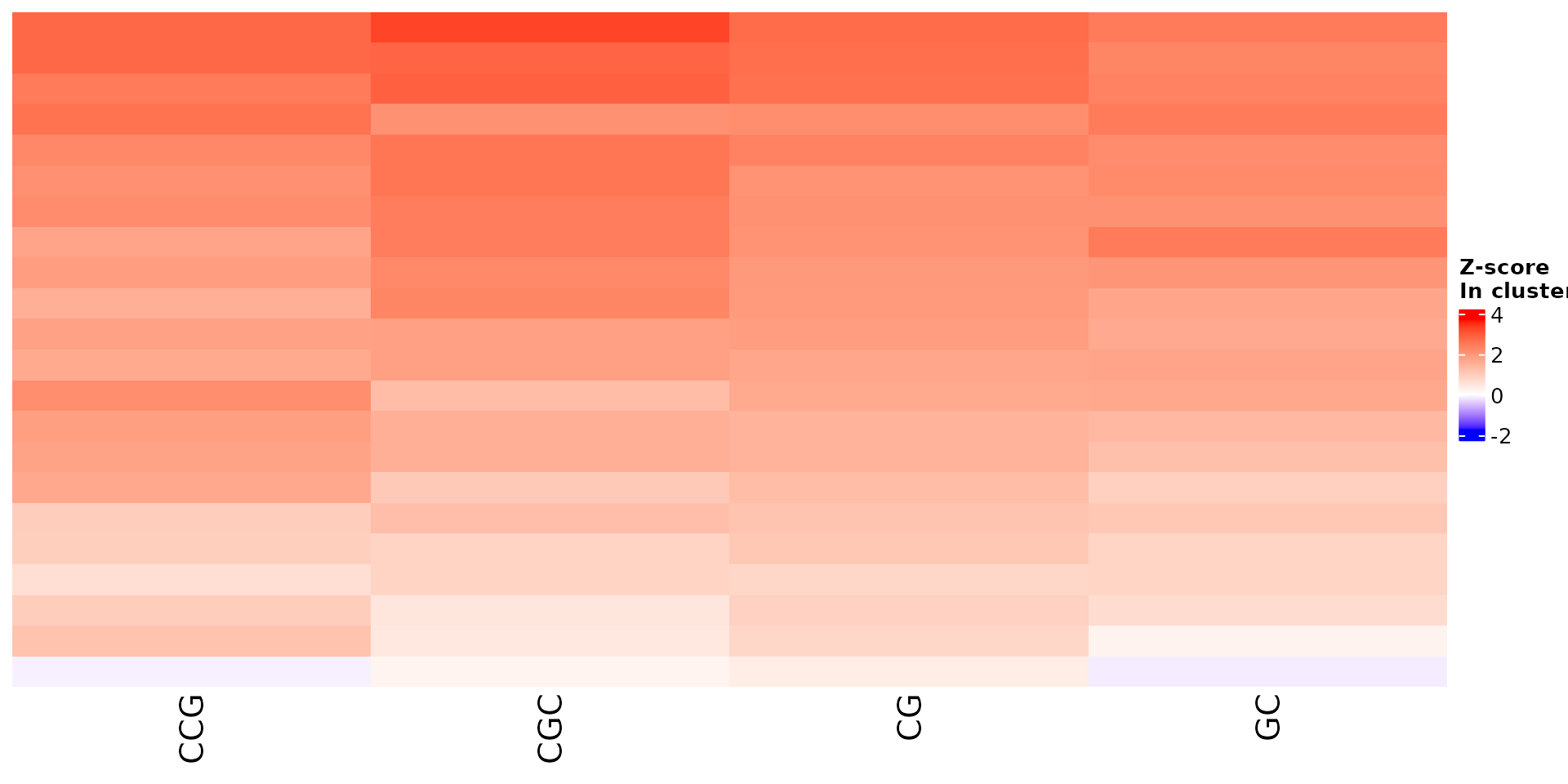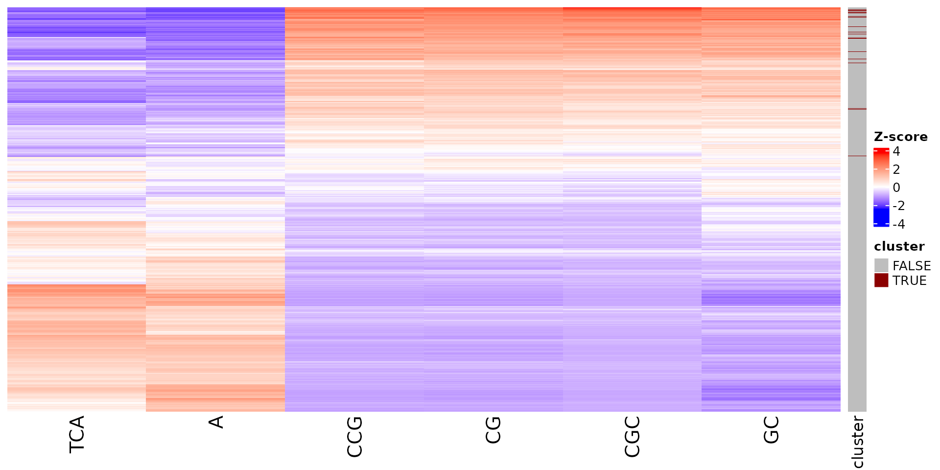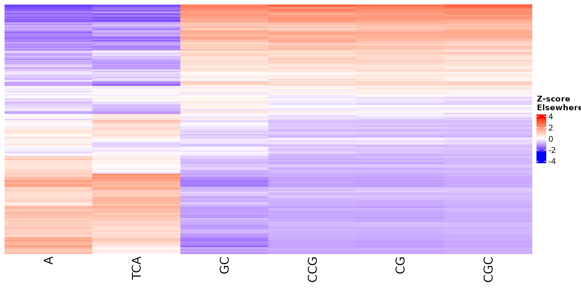 All sequence features are scaled to a z-score within all observations, so red values indicate higher than average values, and blue lower than average. By default, only the important sequence features enriched in the cluster are shown, but all important features including depleted ones can also be shown as follows: