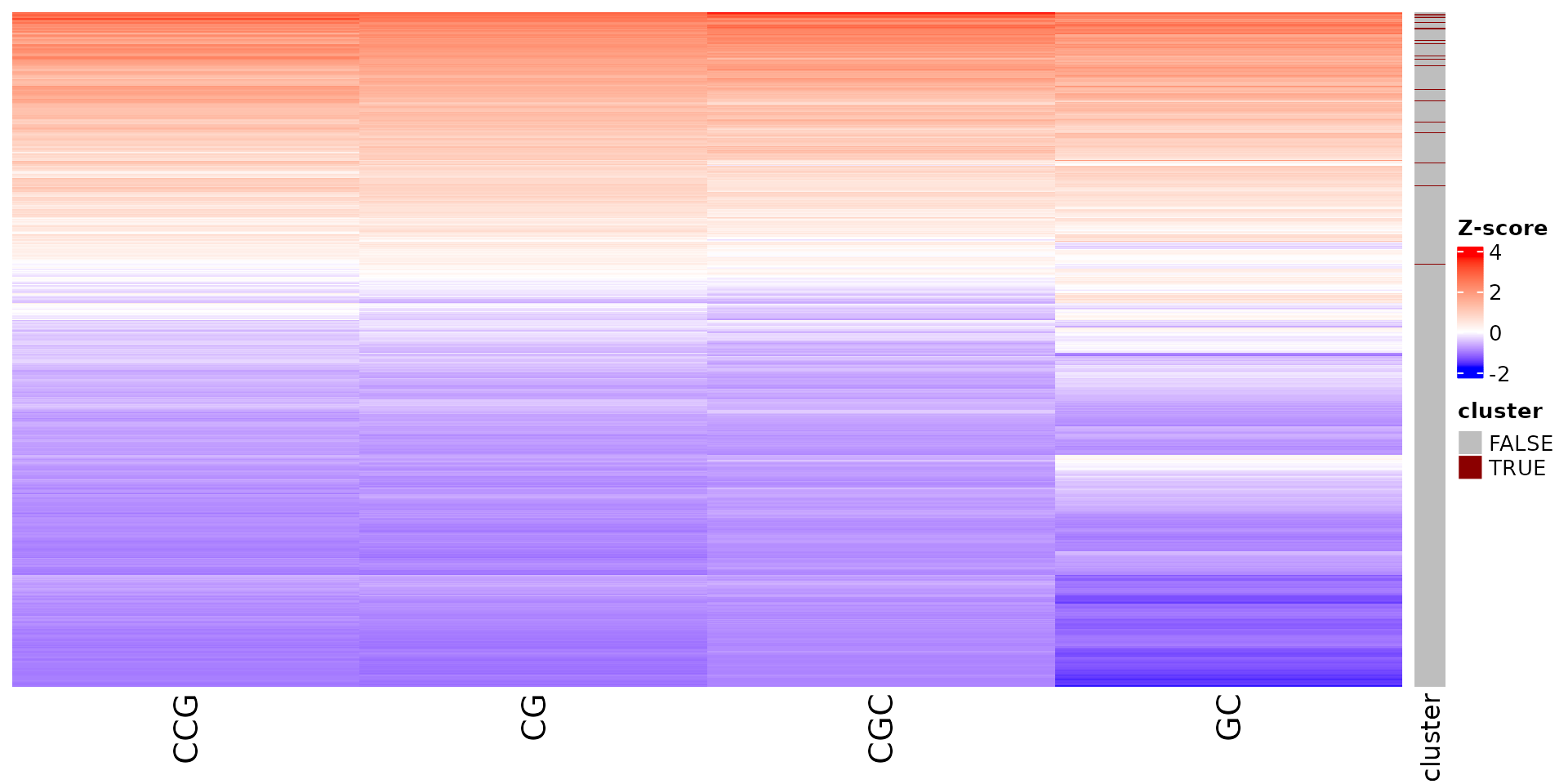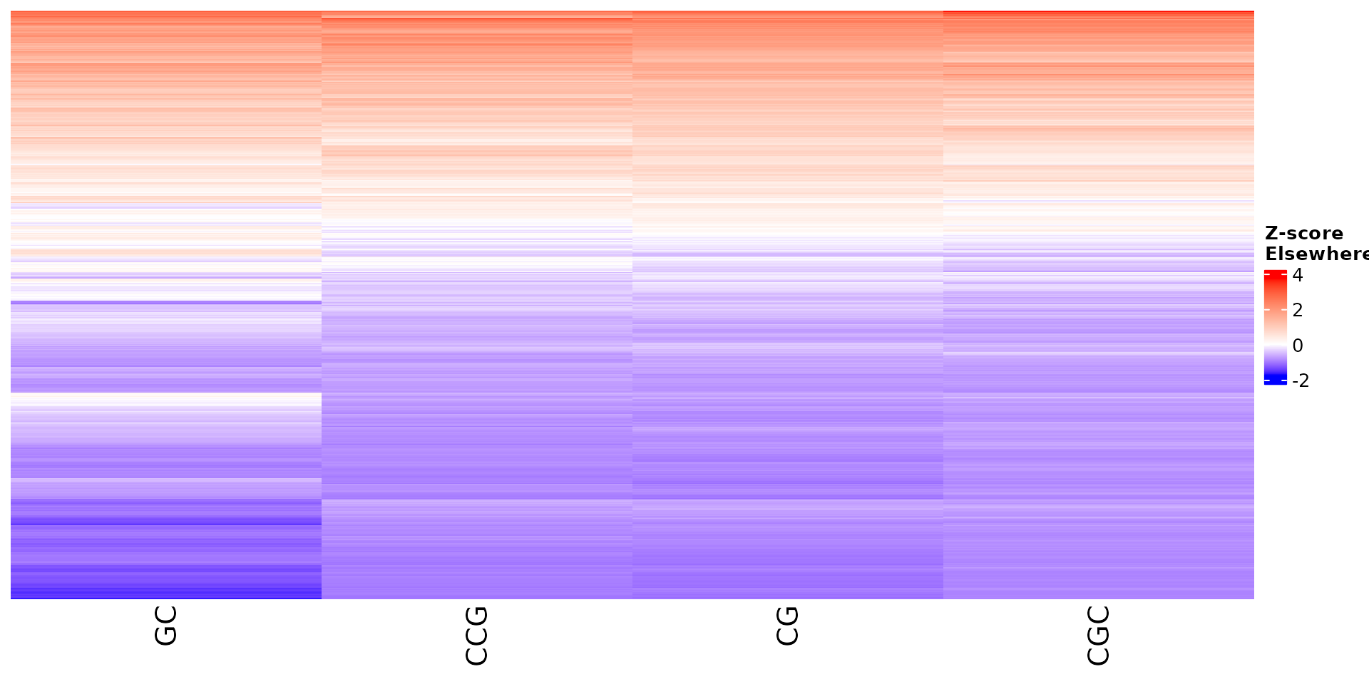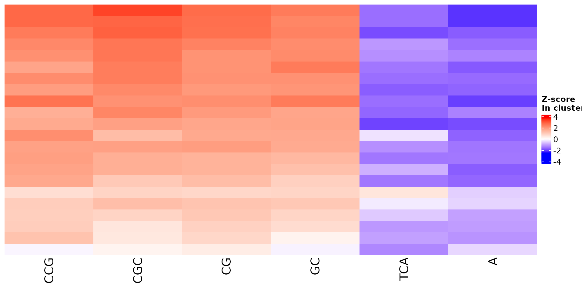 All sequence features are scaled to a z-score within all observations, so red values indicate higher than average values, and blue lower than average. By default, only the important sequence features enriched in the cluster are shown, but all important features including depleted ones can also be shown as follows: